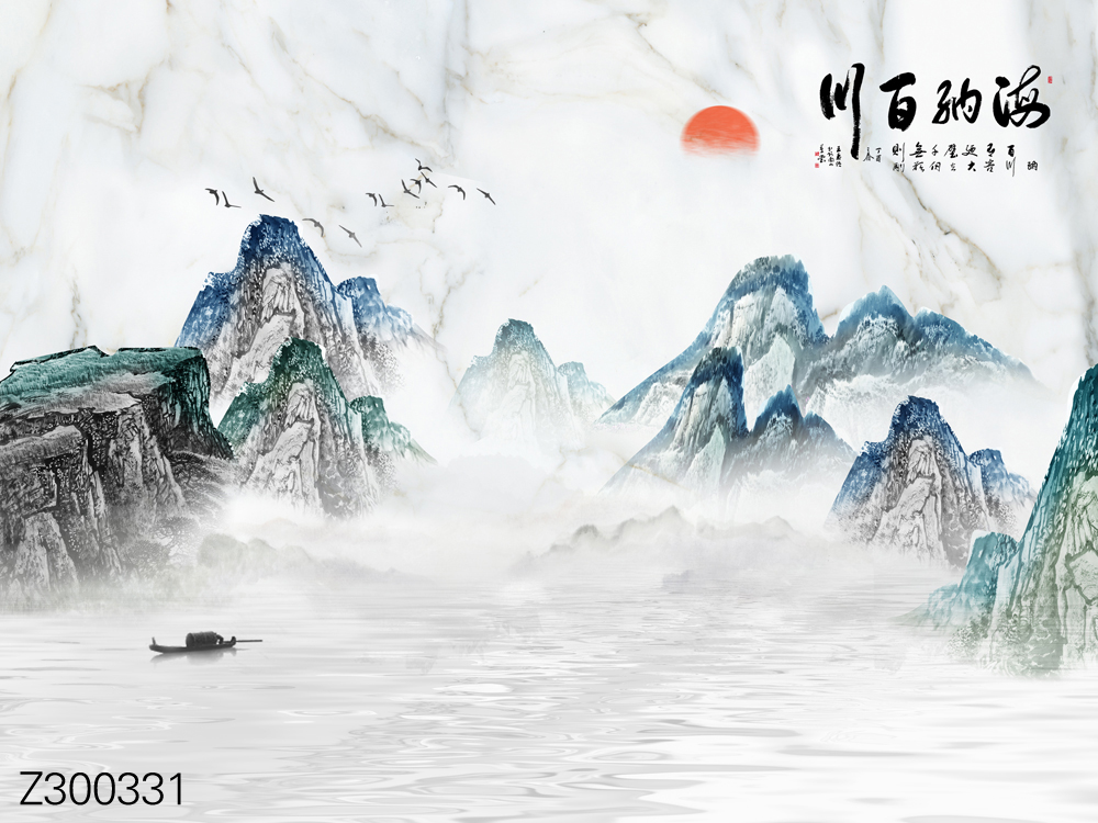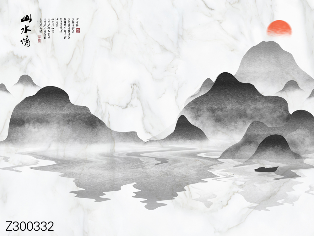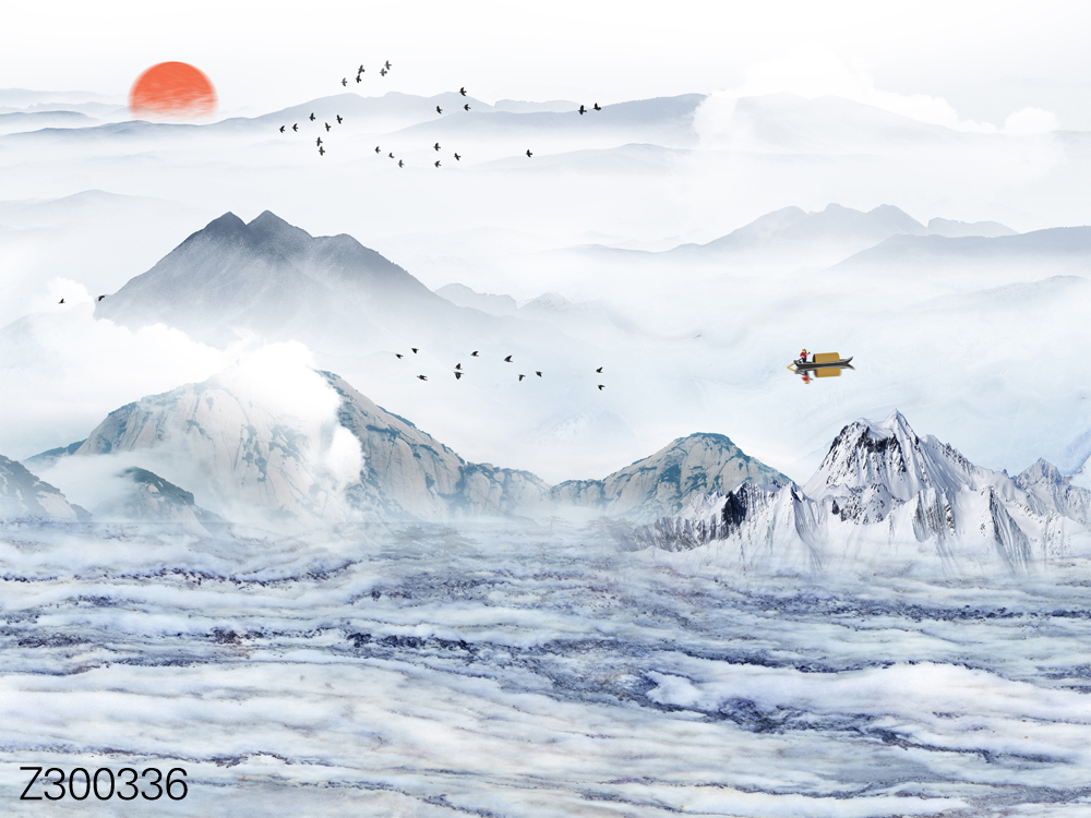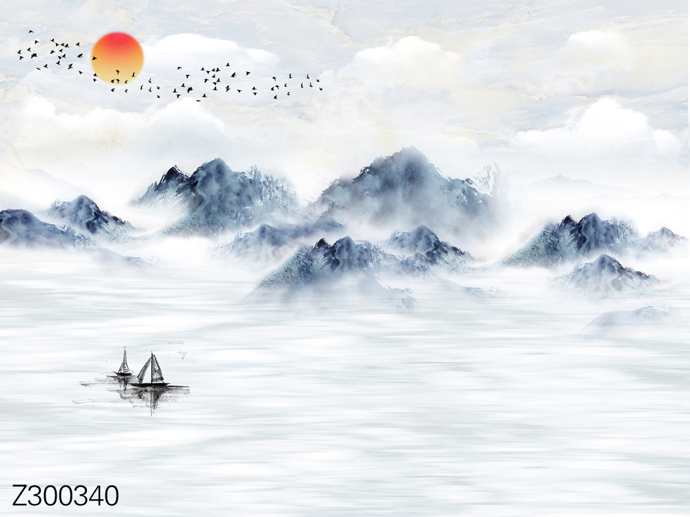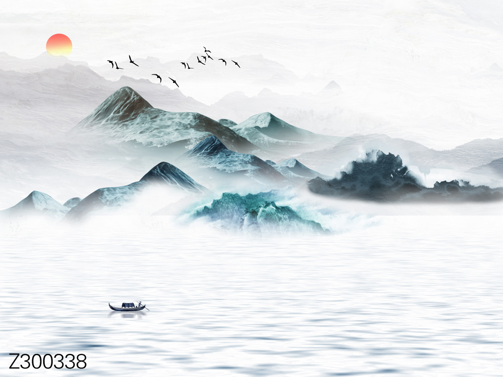 Z300354-新中式简约山水小船飞鸟太阳背景墙.jpg