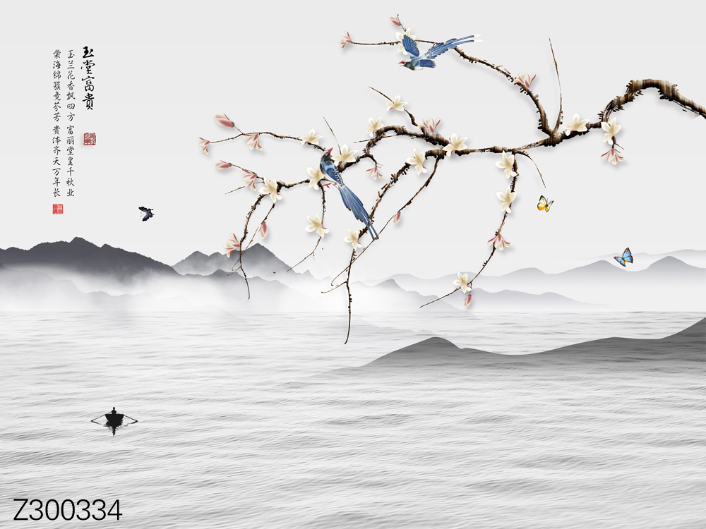 Z300329-新中式意境山水小船花枝小鸟背景墙.jpg