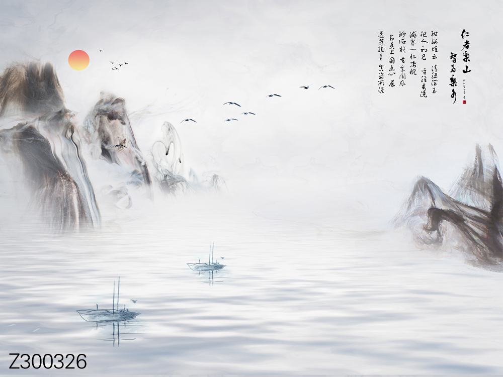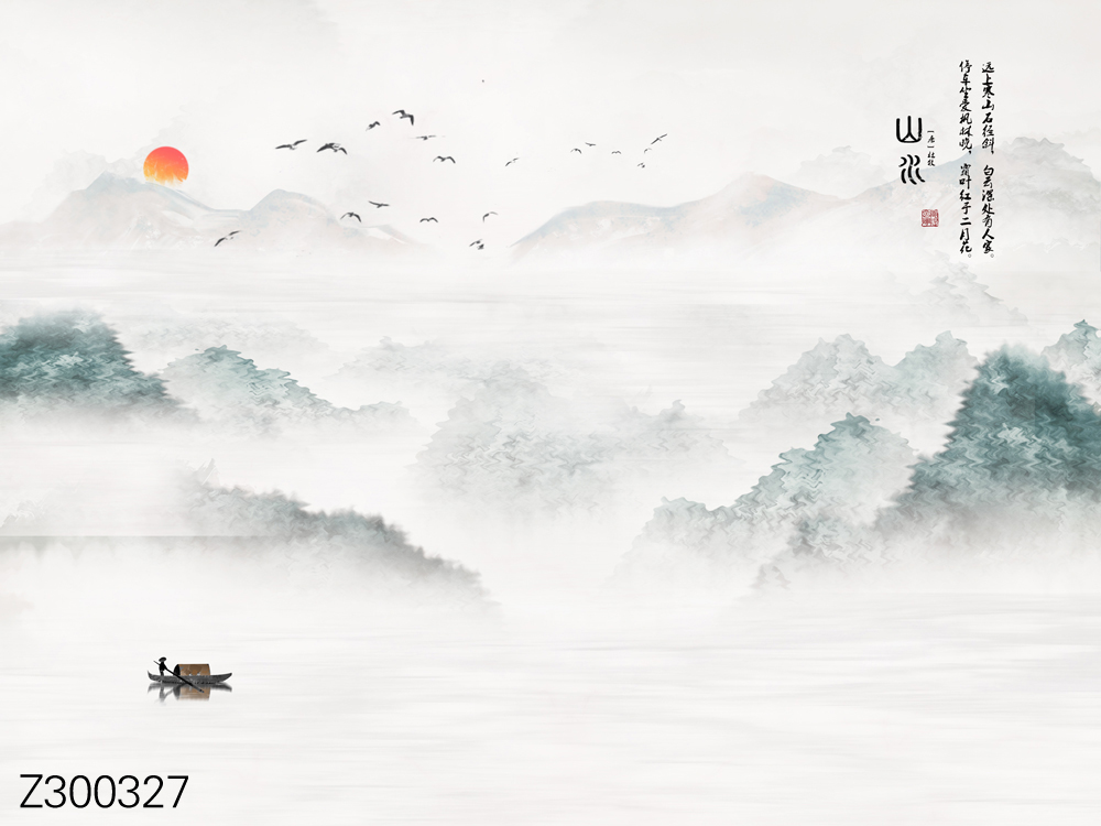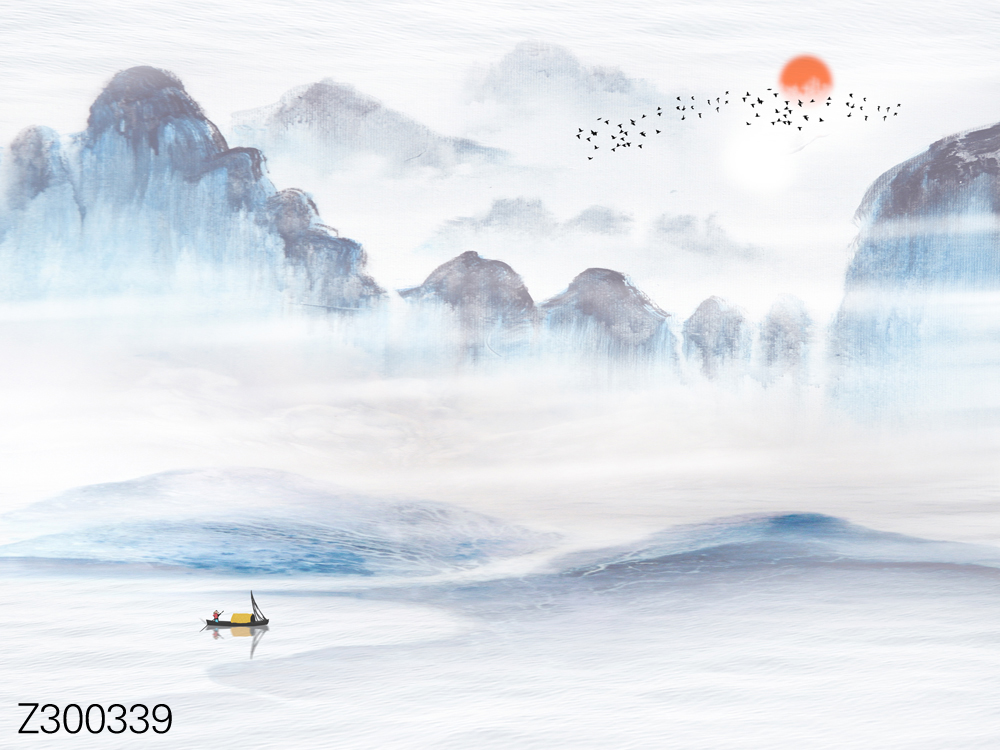 Z300339-新中式意境山水飞鸟小船太阳背景墙.jpg